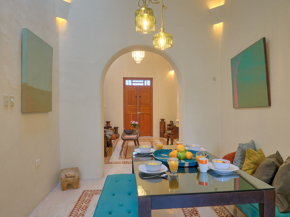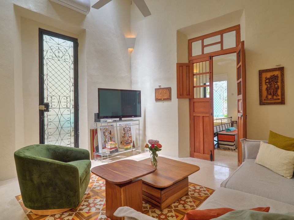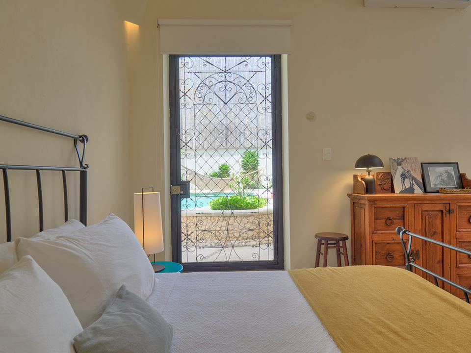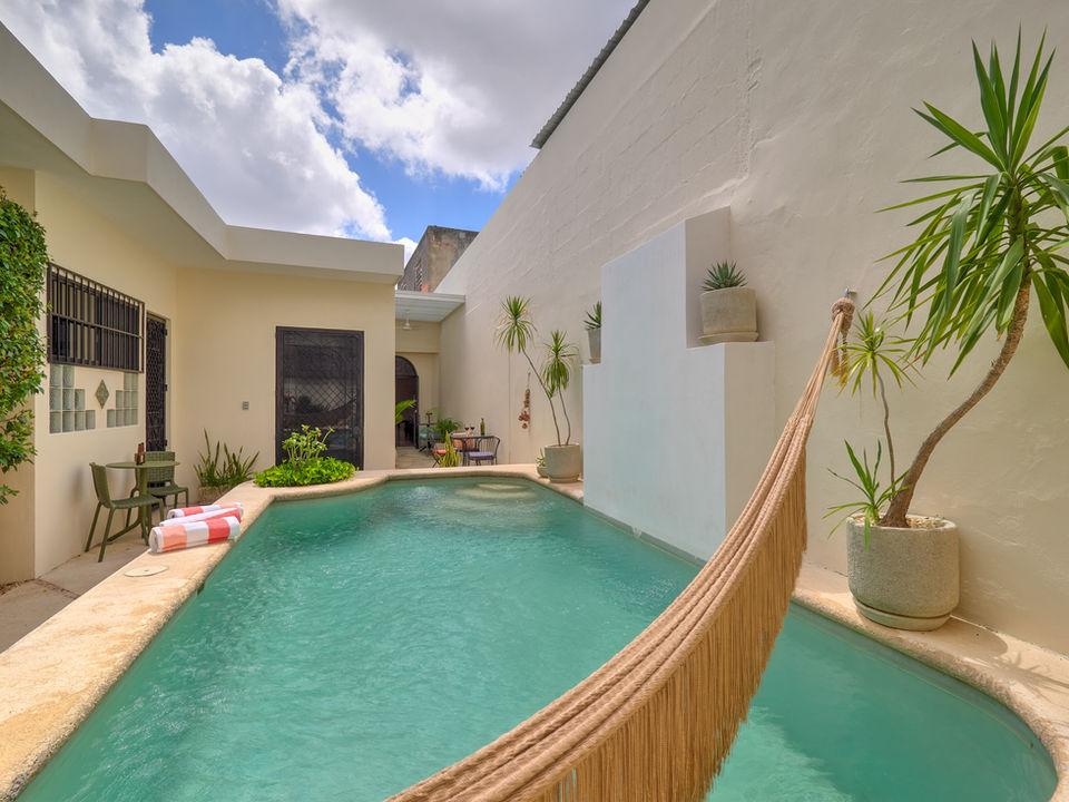 A generous entry hall with arched doorways and local art welcomes you into the house, which has 2 spacious bedrooms, each with ensuite bathrooms, king-sized beds and cotton linens. A comfortable living room with patio access separates the bedrooms allowing privacy. The bright, well-equipped galley kitchen adjoins the dining room and opens onto the courtyard. Open and covered terraces around the private pool offer spaces for lounging, working or dining comfortably in small groups in sun or shade. Additional private workspace in the primary bedroom. A/C and ceiling fans are in all common rooms and bedrooms, as well as ceiling fans under the covered terraces. 2 blocks to Parque de Santa Ana, 3 blocks to Paseo de Montejo, 4 blocks to restaurants on corredor gastronómico on calle 47. There's a garage with an automatic door suitable for a smaller car, and free on-street parking (though a car is not needed to get around).